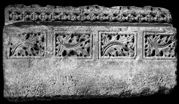 Parte di archivolto (?) scolpita su due facce. Fronte: riquadri con foglia d'acanto, fila di perle alternate a rose a quattro petali; lato: dentelli e palmette a tre a tre