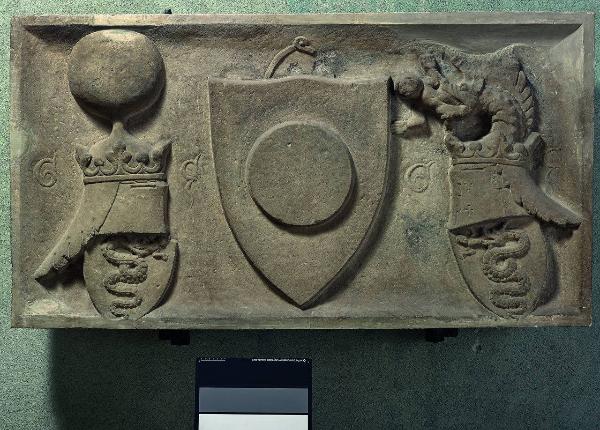 Targa rettangolare in marmo con specchio centrale definito da una cornice a listello. Nello specchio, uno scudo centrale affiancato da due imprese: a sinistra, scudo con biscione sormontato da elmo coronato e da un cimiero a forma di palla; a destra, scudo con biscione sormontato da elmo coronato e da un cimiero con il drago crestato recante un bambino nelle fauci. Ai lati delle imprese l'iscrizione G Z.