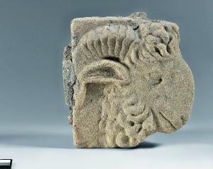 Testa caprina (arietene?) volta a destra, con corna ricurve culminanti verso il basso e vello riccio.