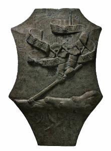 Scudo a testa di cavallo recante sulla fronte un rilievo con l'impresa sforzesca del taglialegna: due braccia uscenti sa una nuvola in atto di tagliare con la scure un grosso albero. Al di sopra dell'impresa, cartiglio con iscrizione TUTO EL TORTO VA IN TAPE. Numerazione 899 in alto a destra.