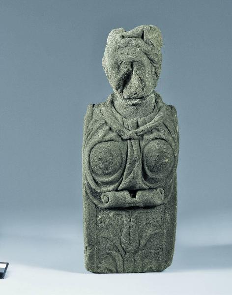 Busto di donna al di sopra di elemento architettonico decorato a motivi vegetali.