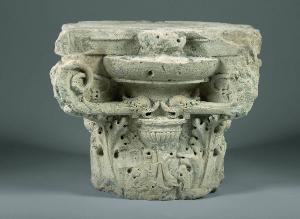 Capitello a un ordine di foglie d'acanto alternate a cantari a cui si abbevera coppia di delfini sorgenti dai caulicoli