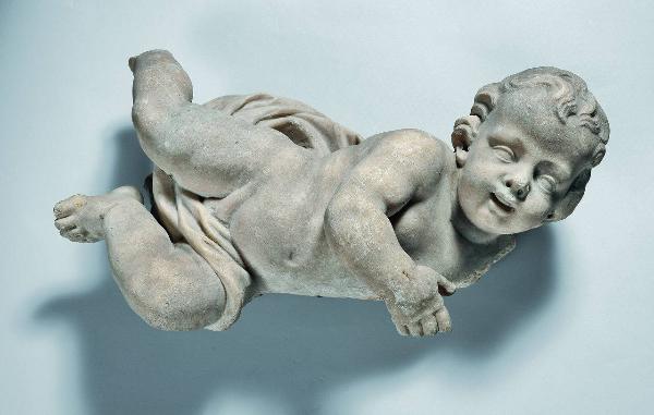 Putto rivolto a destra con il braccio sin. curvo all'altezza del petto, la gamba destra genuflessa, quella sinistra - mancante del piede - rivolta in fuori; un velo si snoda dalla spalla coprendo l'inguine e la gamba sinistra. Il verso, dalla superficie semi sbozzata, presenta un tassello in ferro.