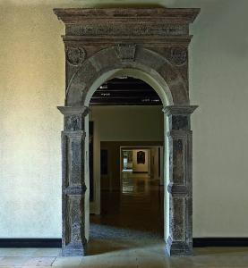 Portale composto da due pilastri su cui è impostato un arco a tutto sesto. Pilastri, arco e timpano sono delimitati da una cornice modanata e il timpano è coronato da un bordo decorato a motivi vegetali. Tra i pilastri e l'arco, due tondi con stemmi a testa di cavallo. Nei pennacchi dell'arco, due tondi condue stemmi a testa di cavallo. In corrispondenza della chiave di volta, mensola tripartita decorata a squame e rombi. Nel lati interno dei piedritti, quattro tondi con teste virili laureate di profilo.