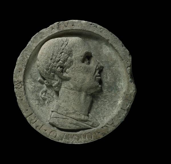 Testa virile laureata rivolta verso destra, raffigurante Marco Tullio Cicerone, come spiega la scritta sul bordo.