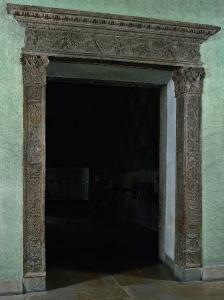 Portale costituito da due pilastri e un'architrave. Pilastro sinistro e destro presentano decorazioni diverse, sul fronte e sul lato interno, raffiguranti racemi vegetali, vasi, putti, delfini. Architrave decorata esternamente con fregio di sette putti danzanti; il lato inferiore presenta un fregio a rabeschi e il monogramma IHS.