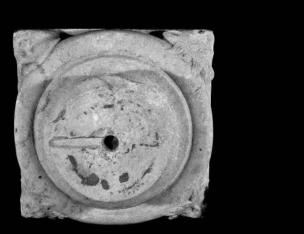 Modanatura a un toro, parzialmente sormontato da tre protomi mostruose e una umana, tangenti gli spigoli del dado quadrato. La colonna di legno non è stata rintracciata.