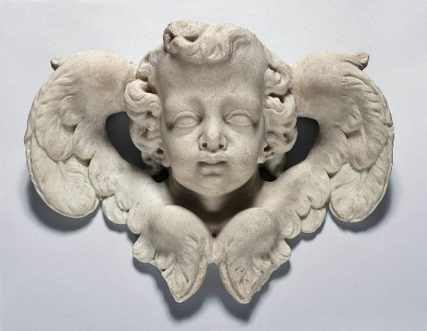 Volto di cherubino con capelli ricci e ali sinuose, terminanti a C.