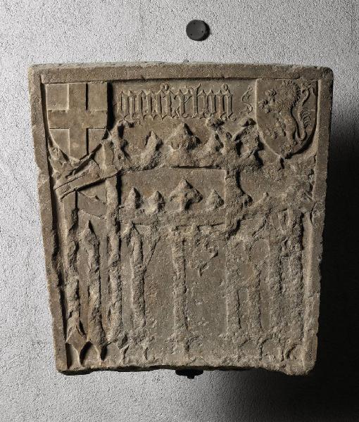 Targa a forma pseudo trapezoidale con bordo inferiore leggermente ricurvo privo della cornice a listello. All'interno della targa, in alto: scudo partito da una croce; scritta MCCCCXLVII; scudo con leone rampante a sinistra. In basso la scritta LIBERTAS; motivo di corona ducale.