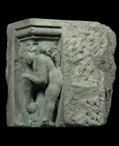 Entro nicchia rettangolare putto alato volto a sinistra; abaco modanato.