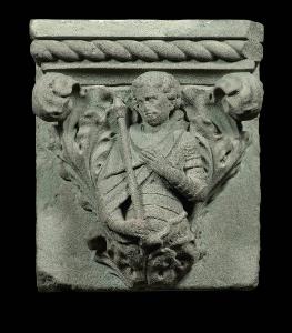 Busto di giovene reggente uno scettro tra fogliami a volute; abaco con cordonatura e listello.