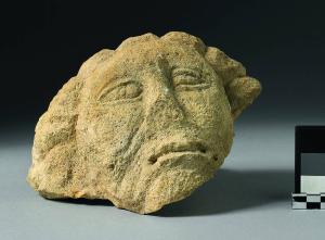 Testa femminile frammentaria incorniciata da capigliatura e tratti fisionomici sintetici, forse non finita.