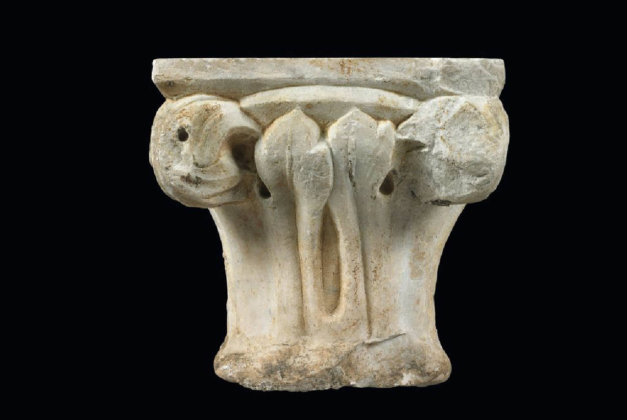 Piccolo capitello a muro con decorazione a un ordine di due foglie lisce costolate, rigonfie alla sommità; due volute angolari a crochet.