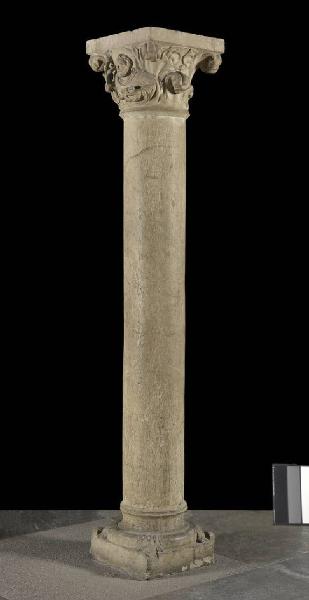- NOTIZIE STORICO CRITICHE Capitello a foglie verticellate con ingrossamento e a costolature aggraziate agli spigoli e nei campi. Nell'un capitello (1055) in un campo la Madonna col bambino; nell'altro (1063) San Giuseppe col giglio. Base con quattro foglie ricurve scendenti sul plinto.