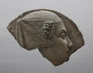 Medaglione frammentario con profilo di Bianca Maria Visconti rivolto a destra. Mutilo di due terzi circa.