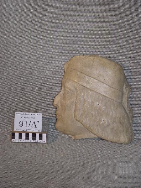 Testa virile di profilo, volta a sinistra. I capelli sono lunghi ed ondulati, la testa è coperta da un copricapo. La punta del naso è perduta.