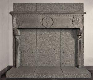 Sulla fronte del camino due stemmi col grifone, lettere A M; tondo con profilo virile rivolto a sinistra, lettere VI F; motto BENEFACERE ET LETARI. Sul fianco destro: stemma con leone rampante. Mezza colonnina applicata sulle spalle laterali, mensola a foglia liscia ricurva; Cimasa a quadretti; sagomatura e cordone.