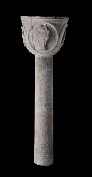 Vasca su colonnina (non pertinente?); quattro tondi a rilievo: San Pietro, Battesimo di Cristo, due stemmi famiglia Grifo (Grifi) con lettere A M