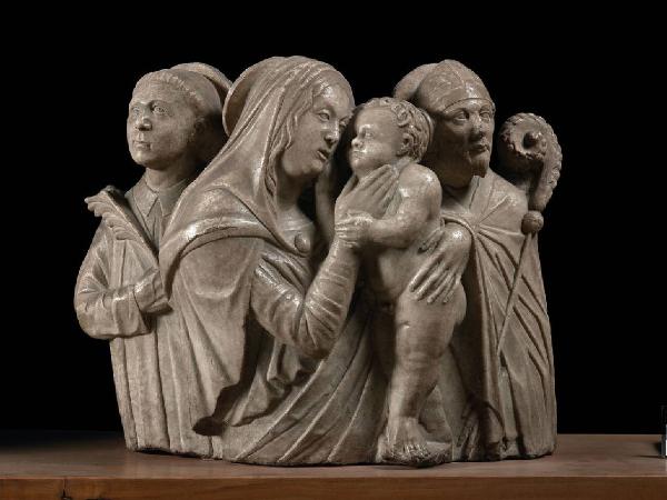 Gruppo (monoblocco) a mezza figura con al centro la Madonna con Bambino, un Santo vescovo e un Santo con palma del martirio; il Bambino è a figura intera