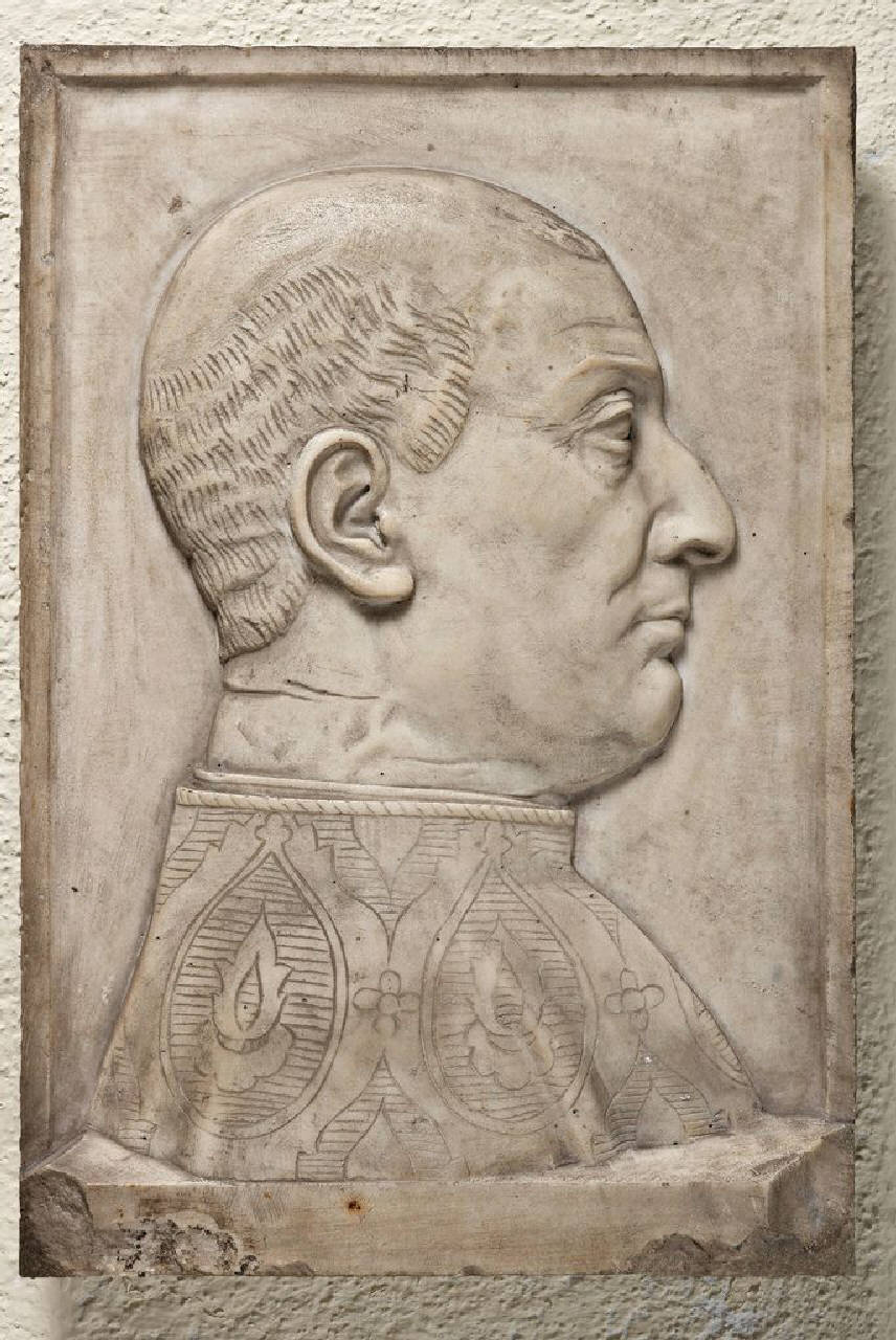 Lastra rettangolare con ritratto a rilievo di Marco Barbo, di profilo a destra.
