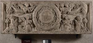 Lastra rettangolare: al centro monogramma di Cristo in ghirlanda formata da teste di cherubini; ai lati quattro angeli per parte (due in volo, due inginocchiati) e coppia di donatori, inginocchiati in preghiera (dietro le loro teste le lettere M, a sinistra, e N, a destra).