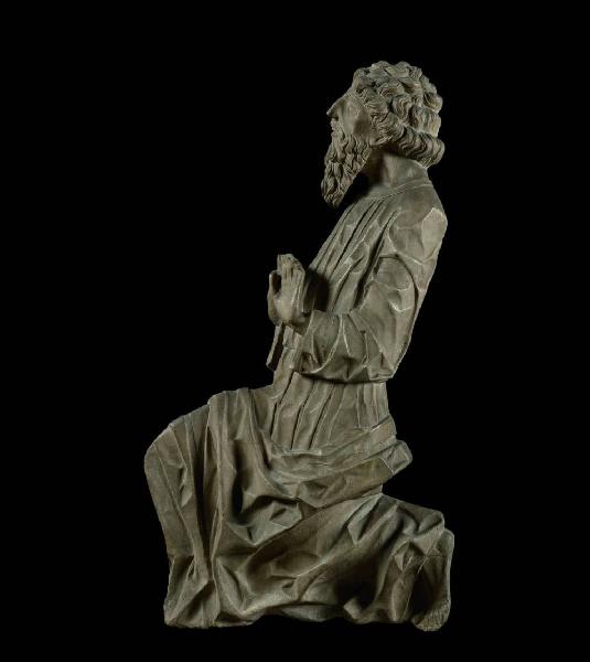 Santo inginocchiato, a mezzo rilievo, volto a sinistra; veste a pieghe "cartacee".