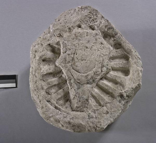 Chiave di volta; fondo lavorato "a conchiglia"; scudo con impresa non identificata (due mani che reggono una rete [?])