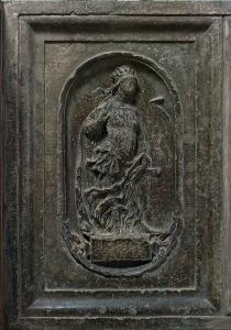 Ovale raffigurante una sibilla, volta destra, poggiante su tabula ansata con la scritta SIBILLA SAVIA; lungo cartiglio inscritto in una lastra rettangolare non pertinente.