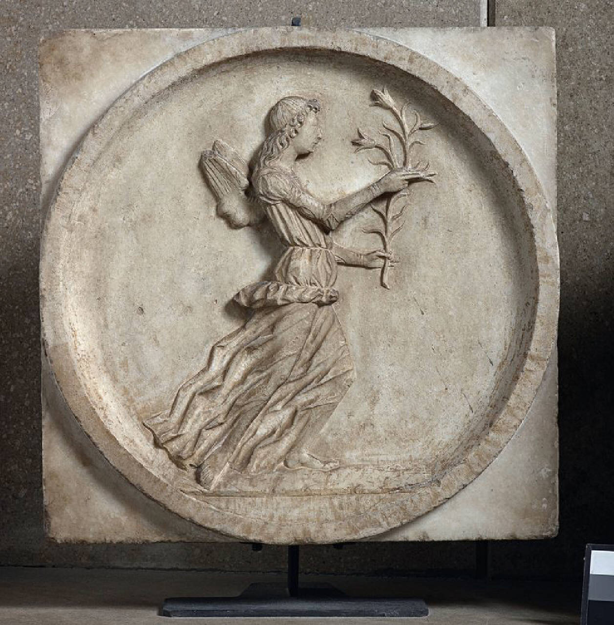 Lastra quadrata con inscritto un tondo: al centro angelo annunziante a bassorilievo, stante, volto verso destra. Giglio in mano.
