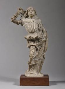 Angelo stante, regge con il braccio destro alzato un flagello