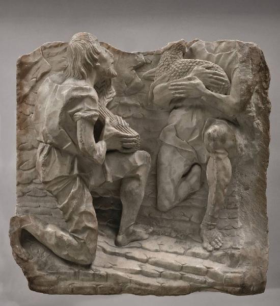 Abele (acafalo) e Caino inginocchiati: Abele regge una pecora, Caino un fascio di spighe. Segni di diversa lavorazione della superficie in prossimità del limite destro.