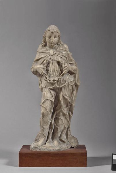 Angelo stante, regge con entrambe le mani una corona di spine appoggiata sul torso.