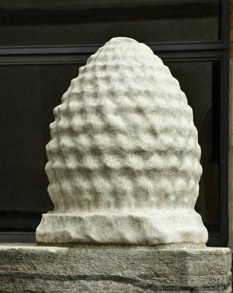Elemento ovoidale solcato da 10 file sovrapposte di incavi e aggetti piramidali in posizione sfalsata; sulla sommità, un incavo contenente in origine un elemento metallico? (croce?, vessillo?)