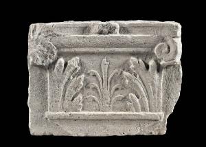 Calato decorato con palmetta al centro, foglie laterali tangenti le volute angolari; semi-rosetta al centro dell'abaco. Base del peduccio (frammentaria) liscia.