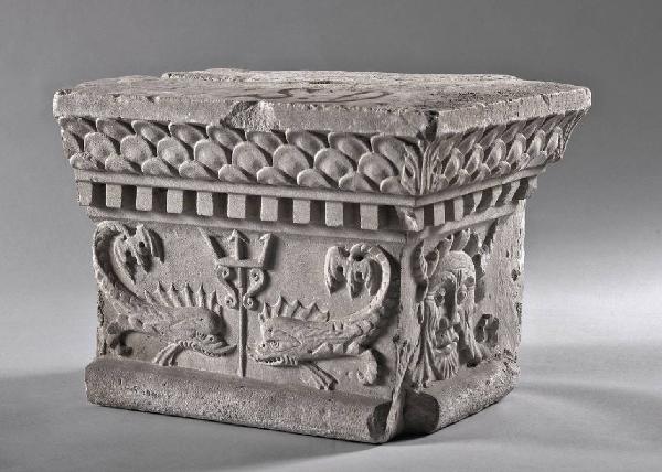 Base decorata con delfini affrontati su una faccia e mascherone su altra; la terza reca la sigla ? S D. Altra segnatura sulla faccia superiore