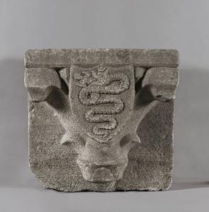 Peduccio con scudo a punta e stemma Visconti sorgente da collarino con tre foglie
