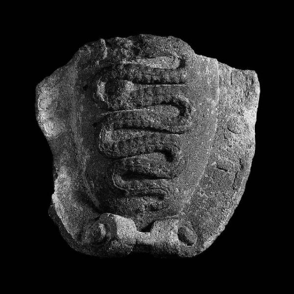 Scudo a cartouche con stemma Visconti del biscione contornato da scritta in lettere capitali. Mutilo parte superiore.
