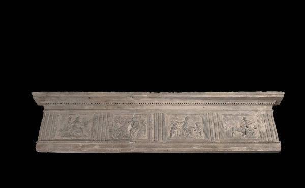 Camino formato da nove pezzi separati. Sul frontale 4 figure allegoriche femminili, ancora da interpretare; sulle spalle laterali le quattro virtù cardinali. Sui due fianchi del frontale sono appese due targhe: in una delle due compare la scritta: DE BONIS OPERIBVS DA GLORIAM DEO