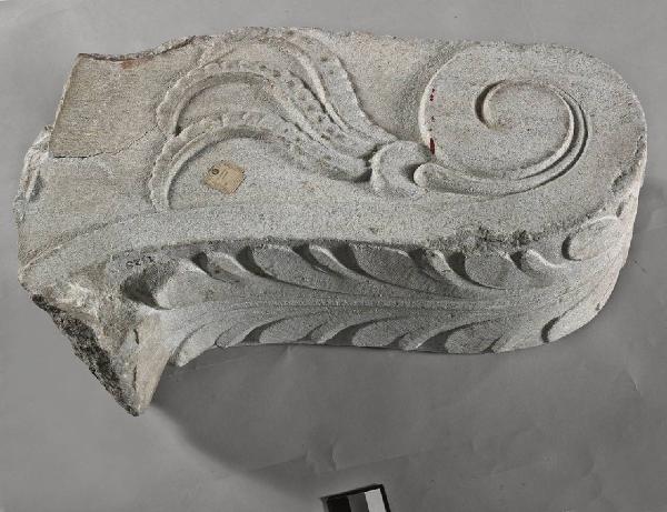 Mensola decorata con un ramo verticale da cui si dipartono, a destra e a sinistra, foglie bilobate; sul lato, volute terminante in nastri perlinati.