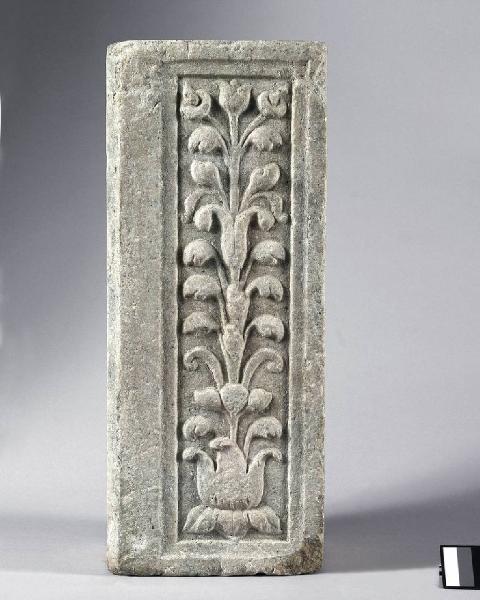Entro lieve modanatura un fiore trilobato fuoriesce un lungo stelo a due ordini di foglie laterali ricurve terminante in un bocciolo e in due calle (?). Reimpiego?