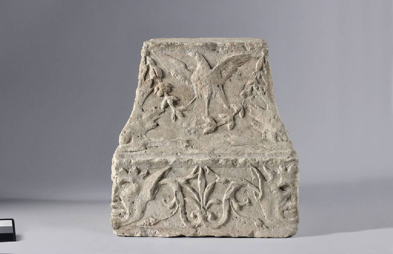 Base di pilastro con decorazioni vegetali, aquila e mascheroni