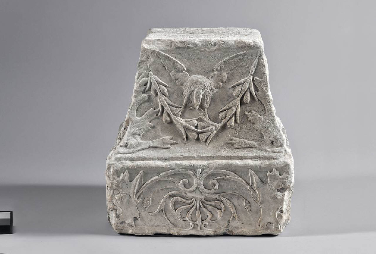 Base di pilastro con decorazioni vegetali, aquila e mascheroni