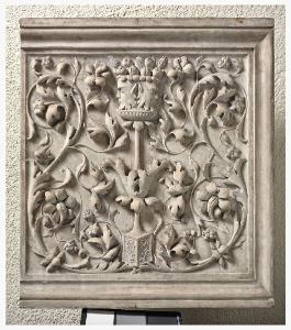 Lastra modanata: al centro, candelabro a base rettangolare con racemi vegetali e vaso con due teste barbute da cui fuoriescono fuori. Dalla base del candelabro partono delle volute floreali con bacche. La lastra sul lato a sinistra è tagliata.