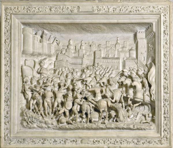 R. E' rappresentata una zuffa di soldati in uno spazio aperto, davanti ad una torre merlata recante il Leone di San Marco.\nSfondo raffigurante la città di Brescia, incompiuto. I bordi della cornice decorata a motivi vegetali, su quello inferiore, un porcospino, emblema di Luigi XII