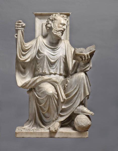 La figura, assisa su alto sedile, regge nella sinistra un libro aperto e in quella destra le chiavi (frammenti), attributo di San Pietro; il piede sinistro appoggia su un globo. Parte posteriore: pilastrino decorato a grottesche; retro del pilastrino, incompiuto.
