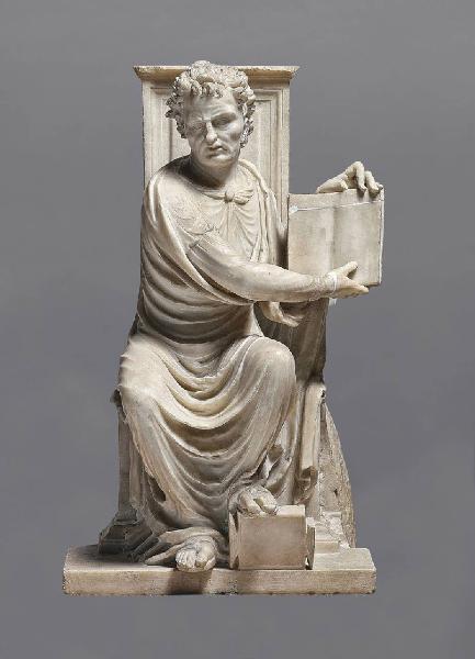 La figura, assisa su stretto sedile, regge tra le mani un libro aperto; piede sinistro poggiante su una targa. Parte posteriore: pilastrino decorato a grottesche su tutti e tre i lati. Il frammento sul naso è probabilmente un rifacimento.
