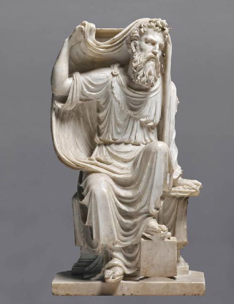 Figura seduta su stretto sedile reggente il mantello nella mano destra, mentre la sinistra è appoggiata ad un libro. Piede sinistro appoggiato su una targa. Parte posteriore: pilastrino decorato a grottesche; retro del pilastrino, incompiuto.