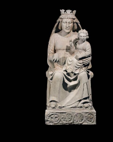 Madonna incoronata seduta su un robusto pancale. La mano destra regge una sfera, l'altra cinge il Bambino seduto sulle ginocchia. Il basamento, un parallelepido con le facce decorate a racemi fogliati. è pertinente all'opera almeno dal XIX secolo. Il basamento non è parte unica con la scultura, ed è composto da tre segmenti decorati uniti ad un blocco liscio sul retro, di una pietra differente.