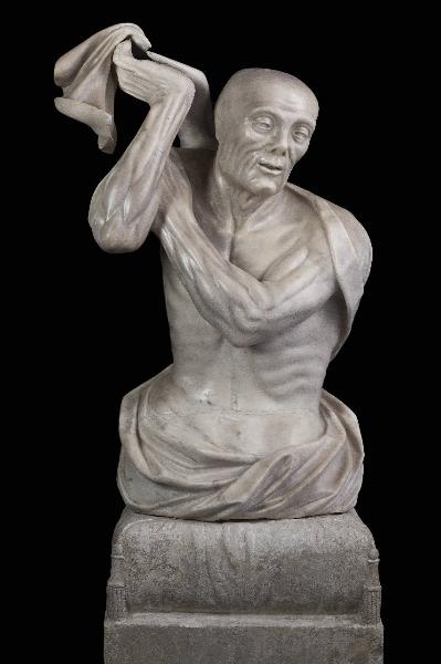 Figura maschile a tre quarti parzialmente avvolta da un mantello che fascia i fianchi; la scultura poggia su un basamento (inv. 2003) pertinente all'opera almeno dal XIX secolo. \nSul retro, lettere capitali da identificare