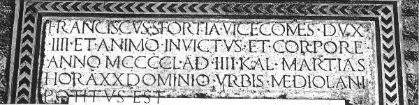 Iscrizione riferita alla presa di potere di Francesco I Sforza; lastra murata nell'atrio di passaggio alla corte ducale da Luca Beltrami